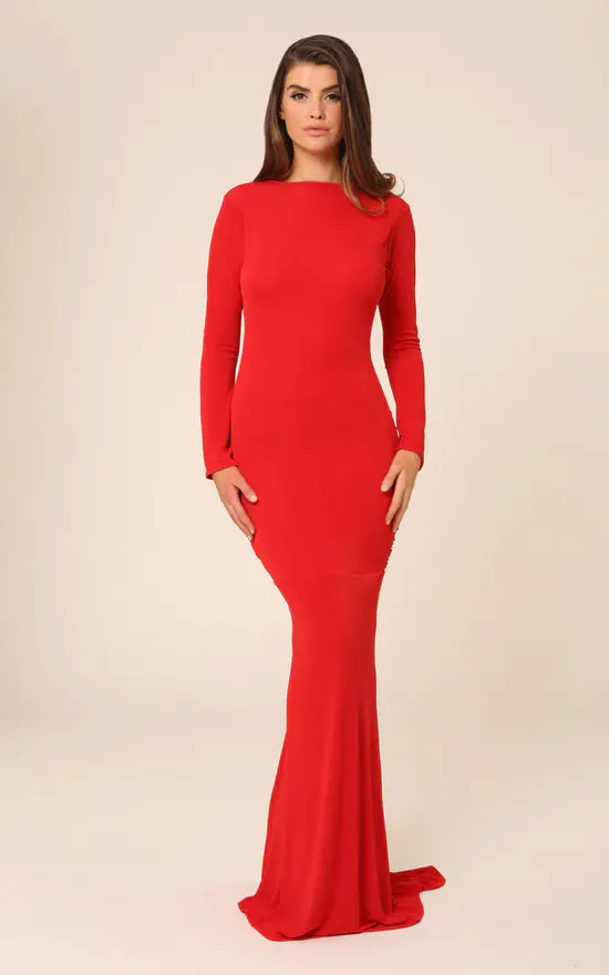 The dramatic backless silhouette of this maxi makes this style a sleek show-stopping look, whilst the body con fit caresses over curves perfectly. The dress has full sleeves and has ruched detailing at the back, which flows into a sweeping train. The neck fastening is embellished with a diamante clasp and a diamante brooch sits gently on the dip of the back. Available in other colours, sleeved version and in midi lengths with fitted sleeves
