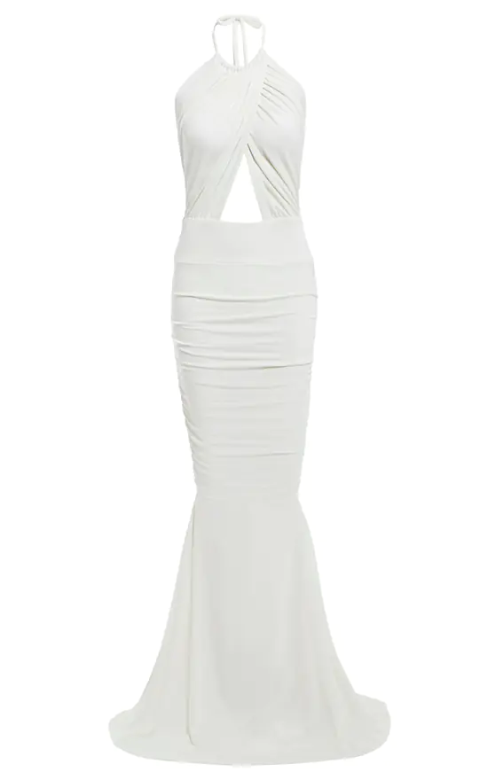 The Erin Maxi is a wrap over halter neck style with a cutout under the bust and crafted in our signature soft stretch fabric this dress has been designed with side ruching so you can ruch to desired length. Lined on the main body its flows into a fishtail (not lined as cut so can give a flowing glamorous fishtail and create the desired hourglass shape). Makes a beautiful bridesmaids dress.
