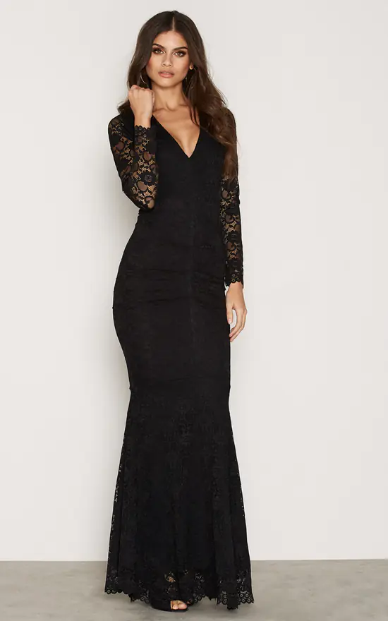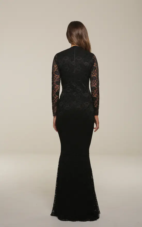 Our Savannah Maxi is a classic Honor Gold style with its deep v neckline made in lace with our signature pleating at the front this is a beautiful dress for special occasions This style features long sleeves with its scallop edge adds a pretty detail to this feminine design.