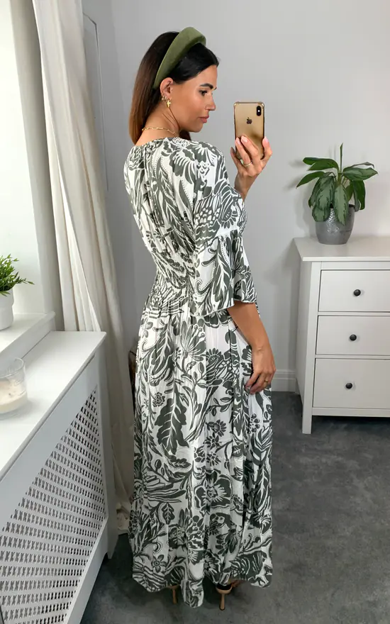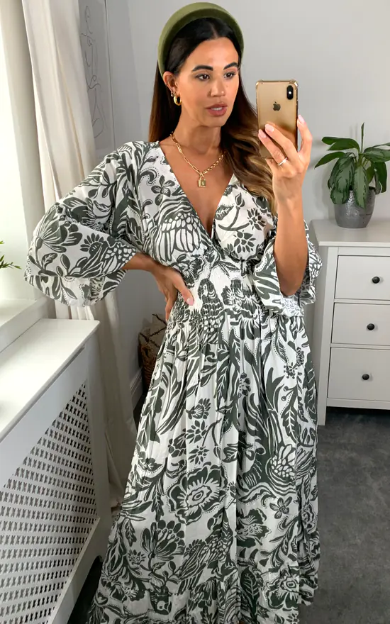 The perfect party dress for this season. Oversized V Neck Detailed Floral Print Maxi Dress in Khaki and White will create the perfect impression to your look!