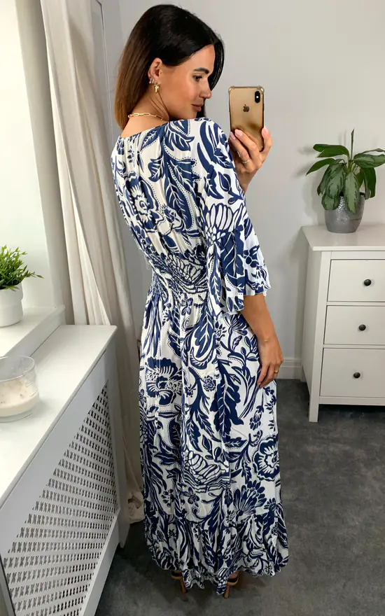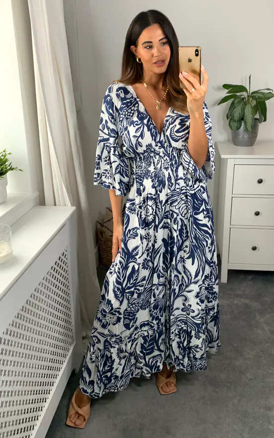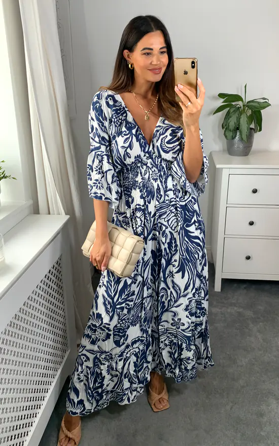 The perfect party dress for this season. Oversized V Neck Detailed Floral Print Maxi Dress in Navy and White will create the perfect impression to your look!