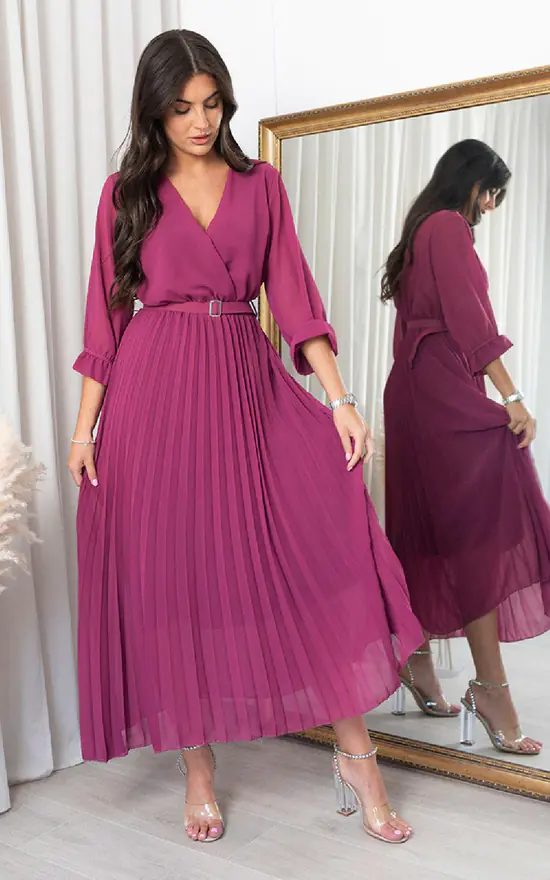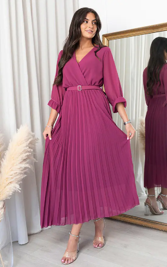 Looking for a fun and flirty maxi dress? Look no further than the Fatima Pleated Maxi Dress with Belt Detail! This playful dress features a pleated skirt, belt detail at the waist, and a V-neckline. It’s perfect for a summer day or evening out. Pair it with some strappy sandals and a cute clutch for a complete look.