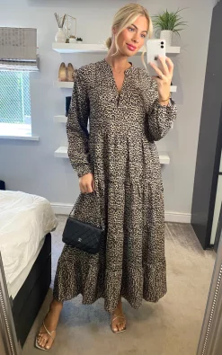 Stay stylish yet comfortable in this animal print smock dress. With a v-neck, long sleeves and a tiered maxi skirt. Style with strappy sandals during the warmer summer months or layer over tights and chunky boots in the cooler autumn period.