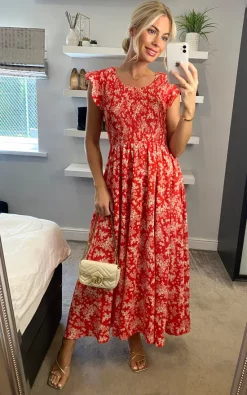 Stand out from the crowd in this vibrant floral smocked dress. With a round neck, a shirred bodice detail, frilled cap sleeves, pockets and a flattering full skirt sitting at the ankles. Style with heeled wedges for a versatile outfit to take you from lunch with the girls to a weekend wedding.