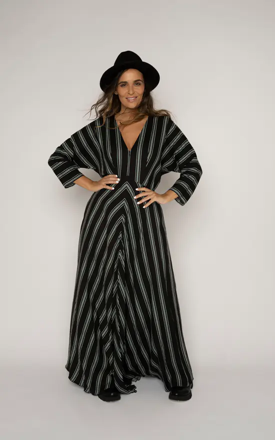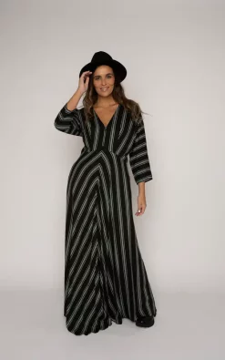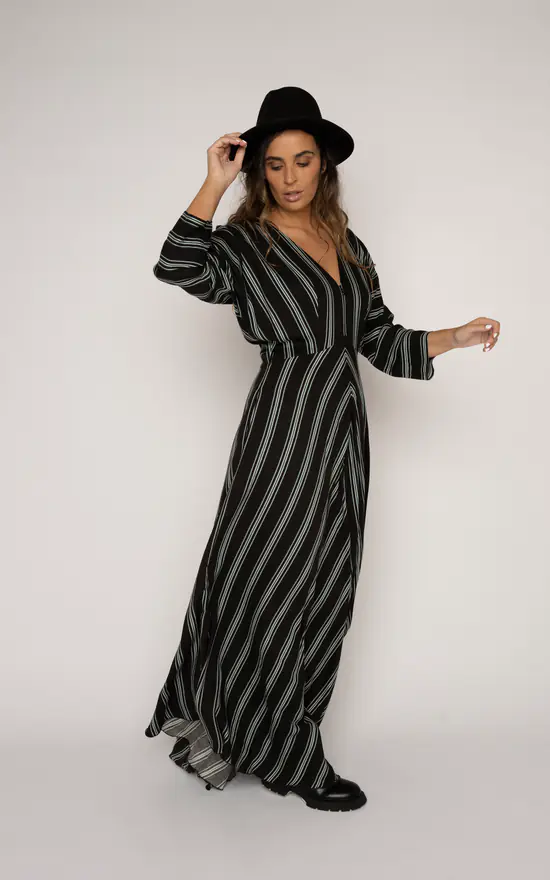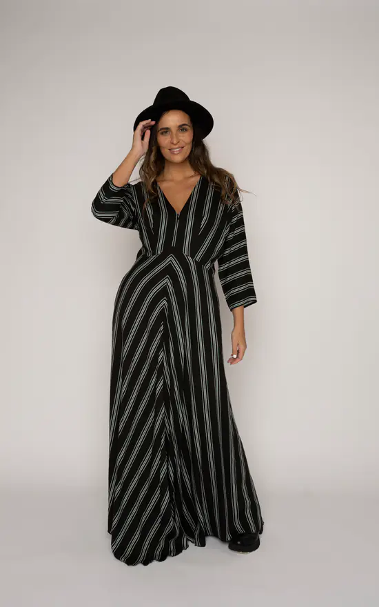 The best selling James Steward Maxi dress made in the UK is now available in a stunning black and green stripe print.