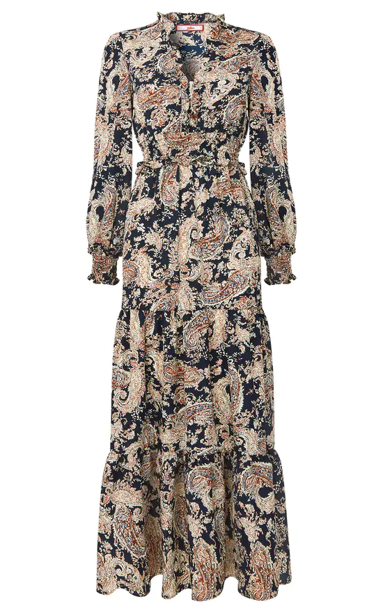 “We love a statement paisley piece, and this dress is no exception. The floaty fabric, frilled neckline and shirred detail pull out the print perfectly, creating a flattering, feminine look youβll love. With darker colours, it’s great for your seasonal clothing collection – just add boots and a jacket to complete this wintery style.