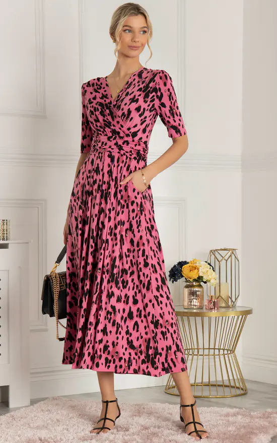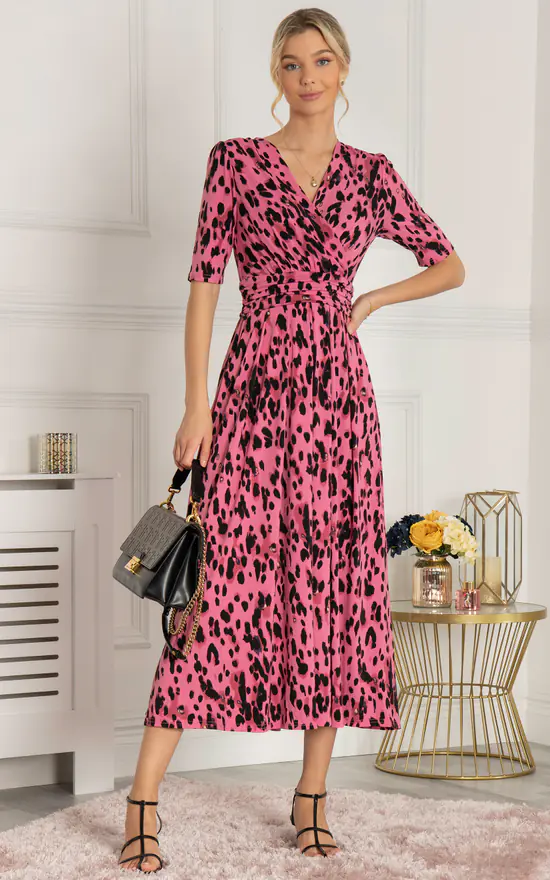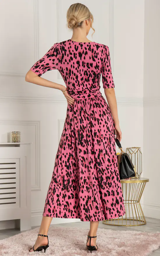 In a flattering fit-and-flare silhouette, this maxi dress by Jolie Moi is decorated with a wild animal print. With a wrap-over front and short sleeves, it is a care-free option for daytime dressing. The perfect addition to any wardrobe this season.