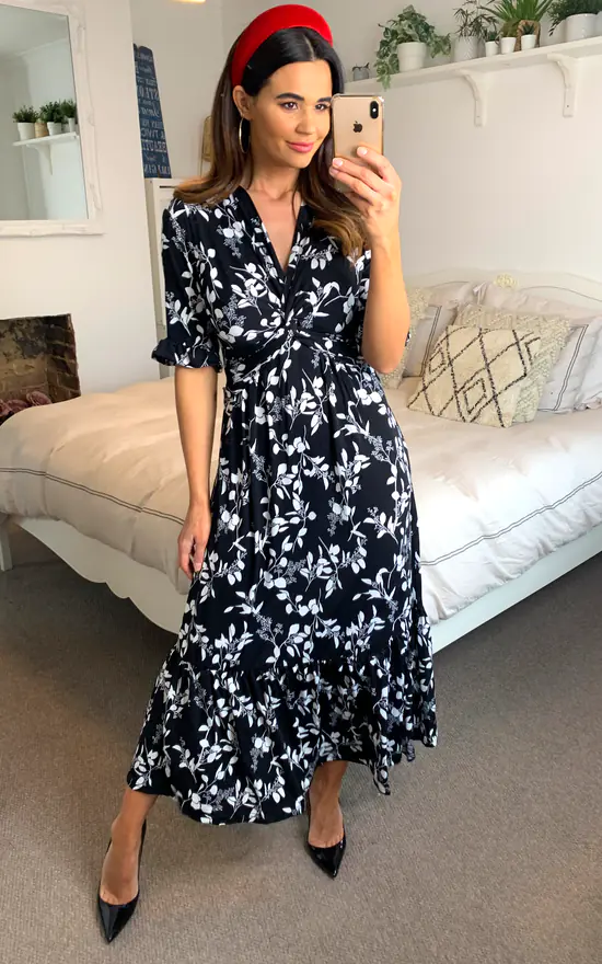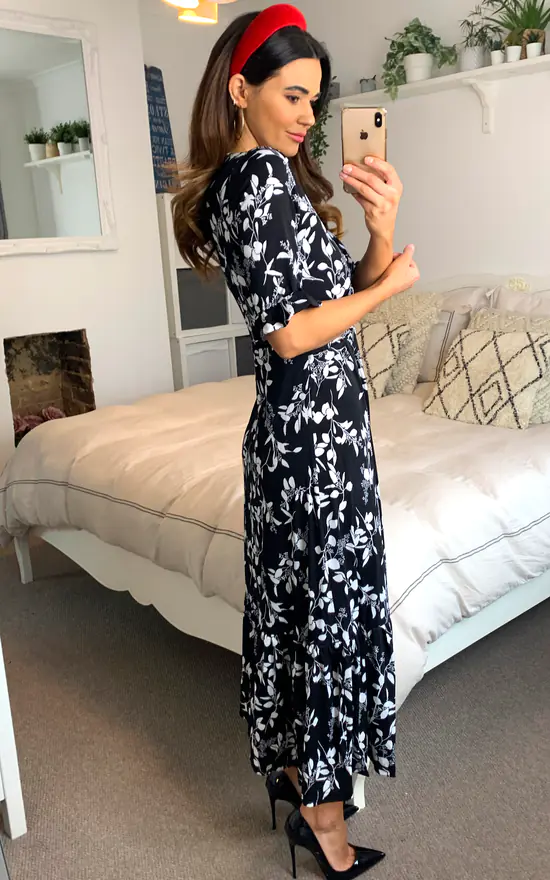 Flaring out at the hem with tiered ruffles for added movement, this midi dress from Jolie Moi catches the eye with a modern abstract print. With a neat v-neckline and elbow-length sleeves, it is a summer fun mu