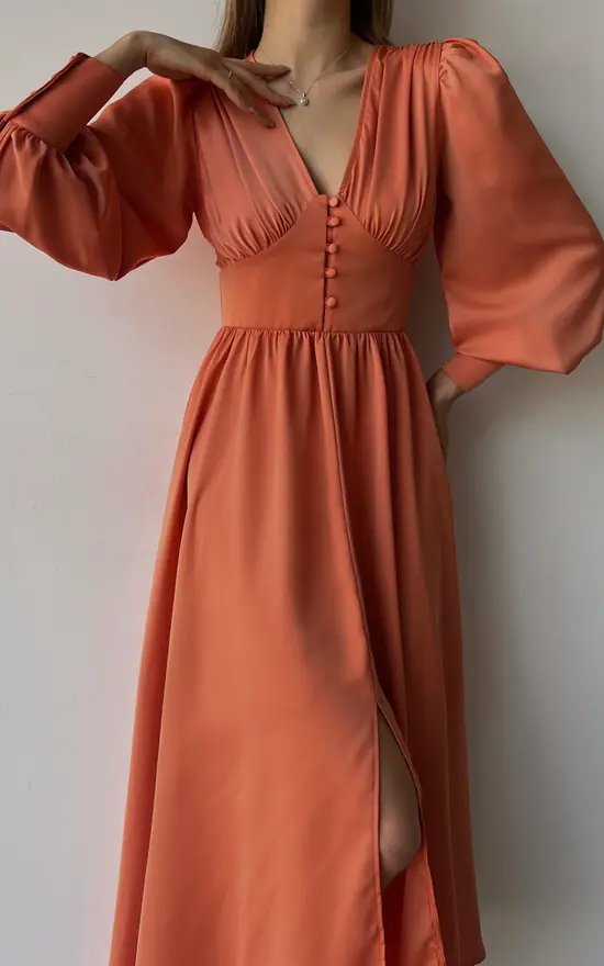 Simplicity is beauty. Lovingly crafted salmon orange satin dress with button detail and figure-hugging silhouette, this dress breathes femininity and delicacy. Wear with heavy autumn boots or pair with high heels – you choose the vibe.