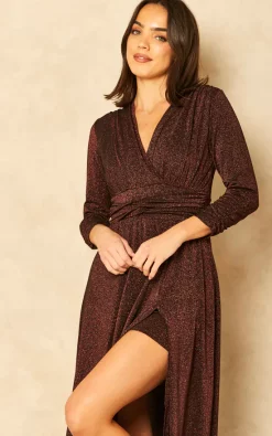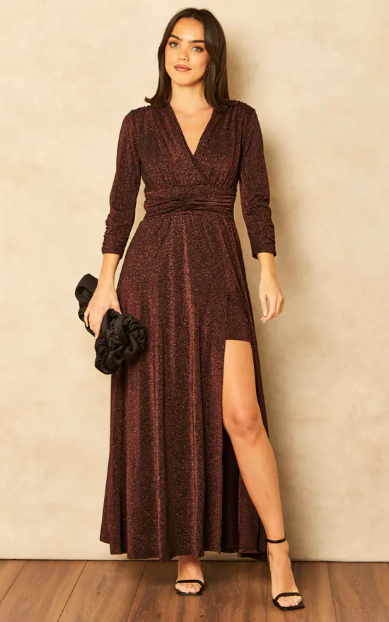 A brand new addition to the Kate & Pippa collection! The Sophia dress features: Long sleeved ruffle detail at sleeve and V Neckline. Long skirt with slit, short skirt underneath and twisted knot detail at waist. Perfect for a fancy occasion, paired with heels.