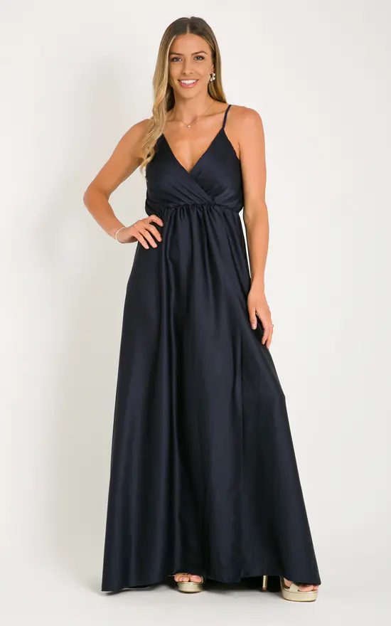 Party-ready full length satin dress in wrap-over design. Adjustable straps and elasticated back secure close fit for effortless freedom of movement.