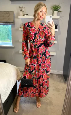 A stunning and classy new midaxi dress. Features a gorgeous pink and orange print, crossover neck, long sleeves with elasticated cuff. Fully lined with pleated skirt, elasticated stretch waist and tie belt. Perfect for weddings, fancy events, holidays. Team with sandals or wedges.