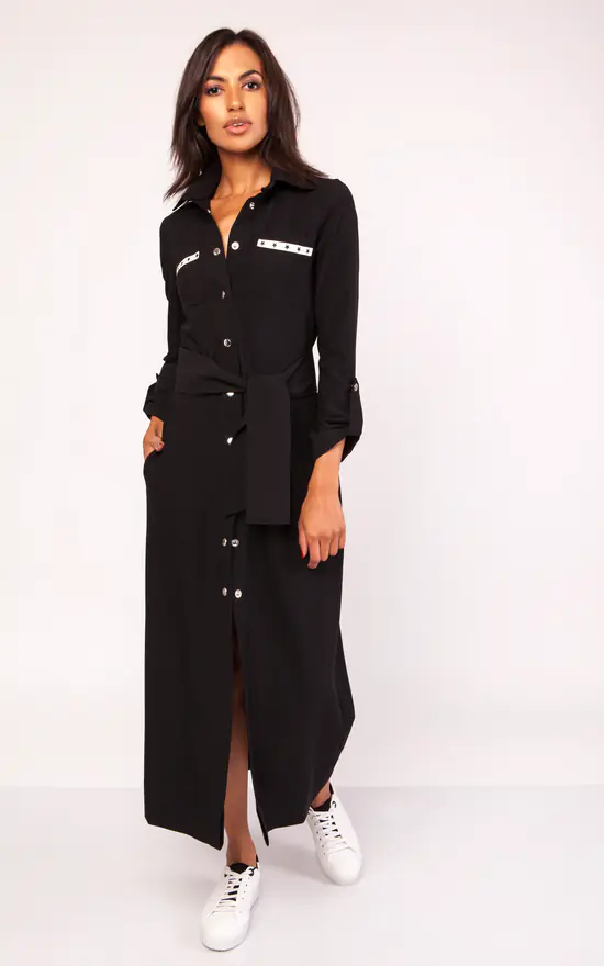 A maxi military-style black dress is a perfect option for everyday style. The dress is fastened with poppers, and includes decorative pockets as well as adjustable sleeves.