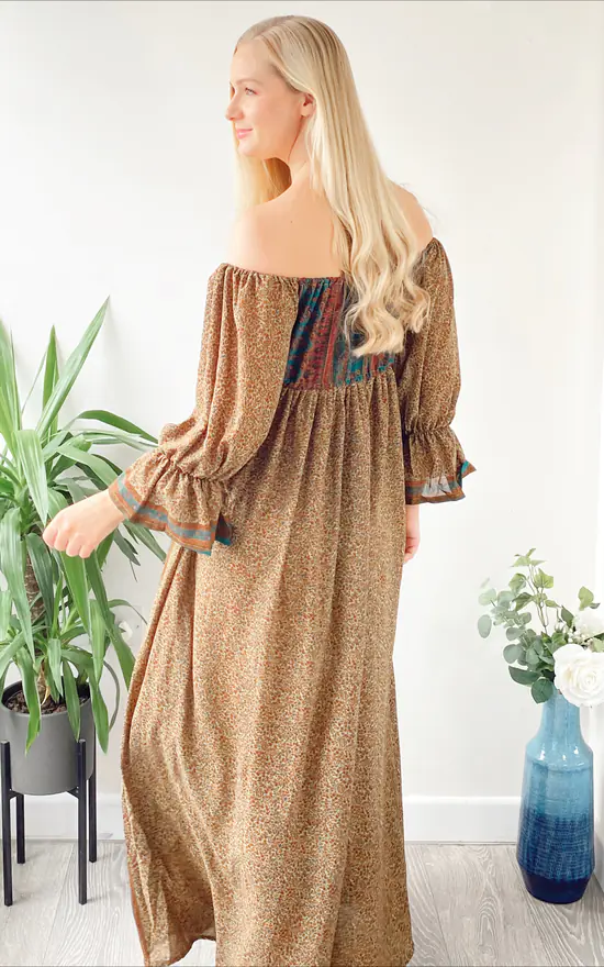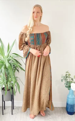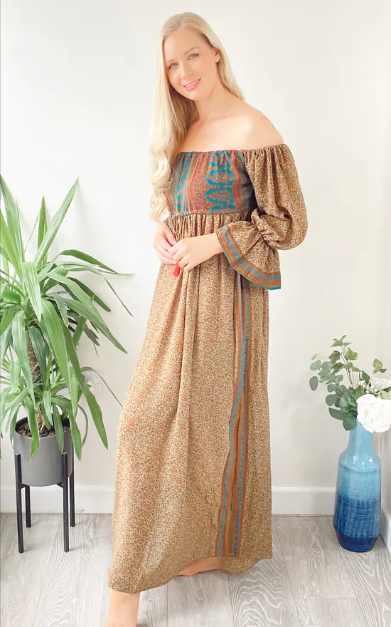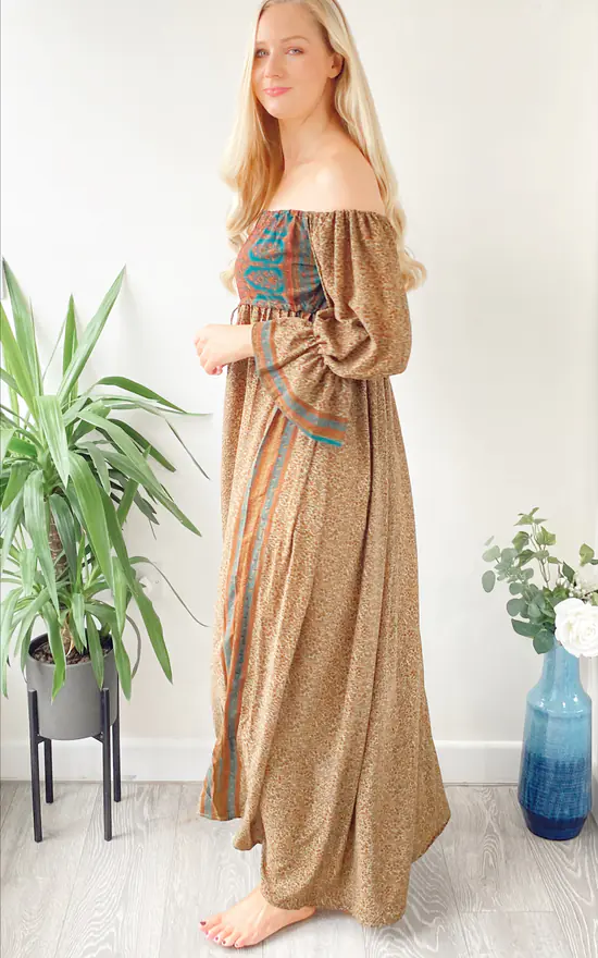 This stunning Bella dress is made from recycled vintage silk and has an elasticated bust and waist. The off-the-shoulder design slips over the shoulders easily and falls into a floaty dress. It features a beige, red and blue vintage-inspired print and is a one-of-a-kind piece you’ll wear all season long. It’s complete with tassels at the front for a bohemian spin. The fit is a free size and fits UK 8-14. You simply adjust the drawstring bust to suit your figure.