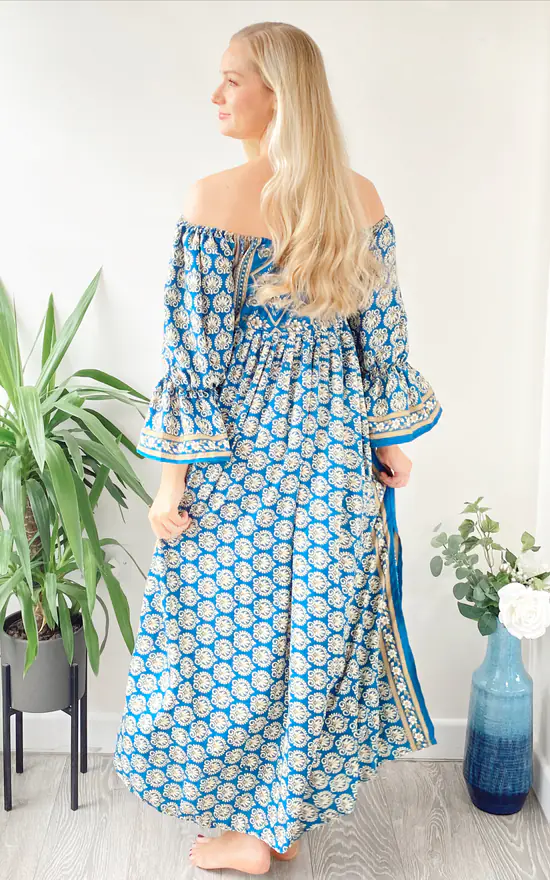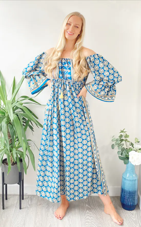 This stunning Bella dress is made from recycled silk and has an elasticated bust and waist. The off-the-shoulder design slips over the shoulders easily and falls into a floaty dress. It features blue vintage print and is a one-of-a-kind piece you’ll wear all season long. It’s complete with tassels at the front for a bohemian spin. The fit is a free size and fits UK 8-14. You simply adjust the drawstring bust to suit your figure.