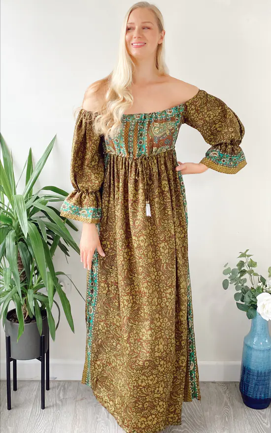 This stunning Bella dress is made from recycled silk and has an elasticated bust and waist. The off-the-shoulder design slips over the shoulders easily and falls into a floaty dress. It features a khaki and brown floral vintage print and is a one-of-a-kind piece you’ll wear all season long. It’s complete with tassels at the front for a bohemian spin. The fit is a free size and fits UK 8-14. You simply adjust the drawstring bust to suit your figure.