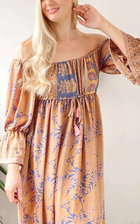 This stunning Bella dress is made from recycled silk and has an elasticated bust and waist. The off-the-shoulder design slips over the shoulders easily and falls into a floaty dress. It features a nude and blue vintage-inspired print and is a one-of-a-kind piece you’ll wear all season long. It’s complete with tassels at the front for a bohemian spin. The fit is a free size and fits UK 8-14. You simply adjust the drawstring bust to suit your figure.