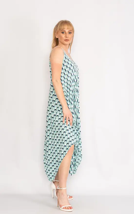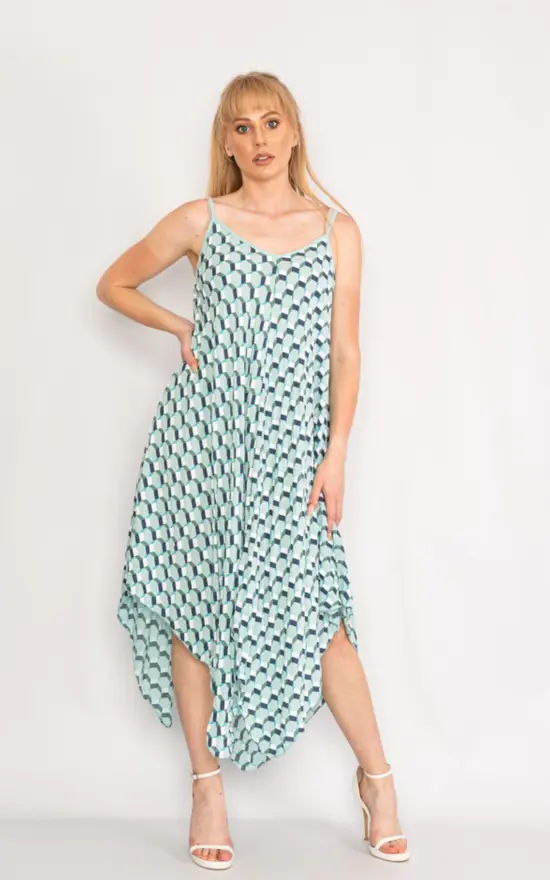 This geometric pattern ads a lot of detail to this stylish summer dress. Made with a loose fit and strap shoulders that is perfect for warm weather.