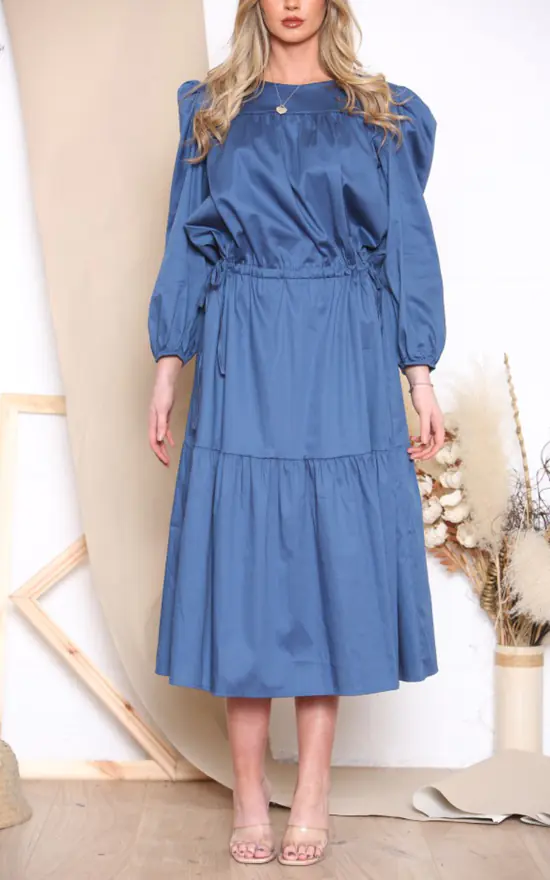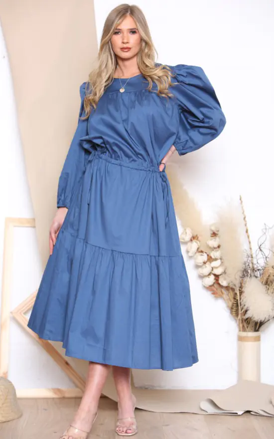 This long puff sleeve round neck shirt maxi dress featuring a poplin fabric. With adjustable waist string for tie up.