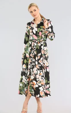 This dress is made from luxury cotton satin printed with flowers and leaves, it has buttons through the front and slightly flared hem.
