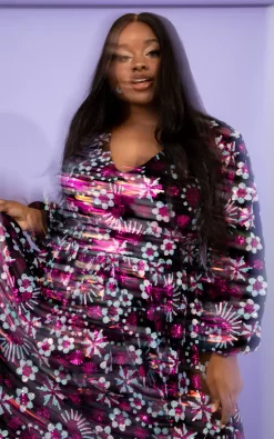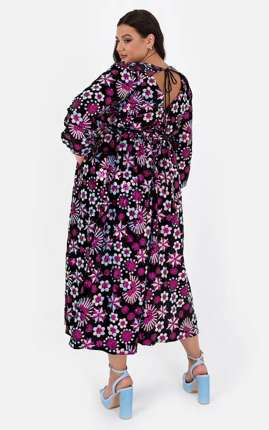 Experience love at first sight with this shimmering masterpiece. Detailed with an explosion of hand sewn floral appliques over the soulful velvet base, this ankle skimming dress is sure to become your favourite party outfit. A-line silhouette with long sleeves is the most comfortable shape this season, and the deep V neckline and keyhole detail to the back add a daring note to this charming piece. Designed with hidden side pockets, so you can leave your clutch bag at the door.