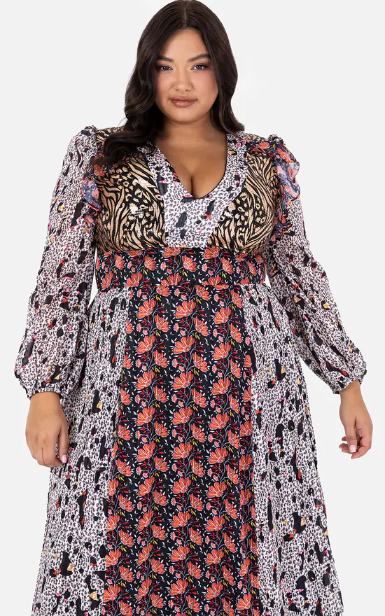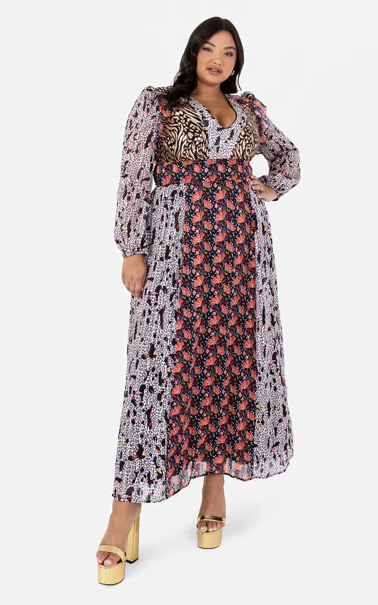 Mood boosting prints intertwine on this glamorous maxi dress spotlighting animal and floral print iterations. A-line silhouette on this maxi dress features a classic V neckline long elasticated sleeves and floor sweeping skirt making this a great transitional piece so you can wear it throughout autumn and winter months. Hand embellished zebra print on the bodice contrasts with the delicate chiffon fabric adding light sparkle to the overall look. No need to accessorise simply pop your black heels on and let the dress do the talking.
