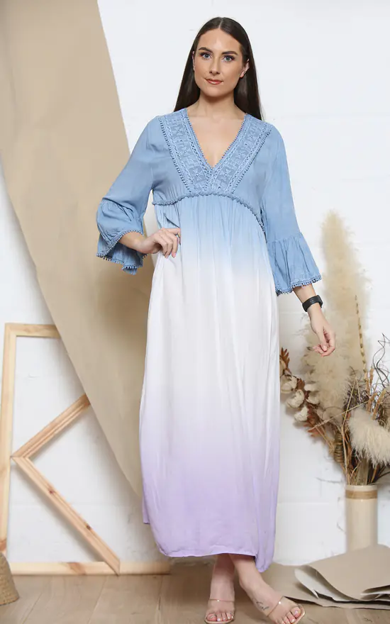 This smart dress has a colourful tie dye pattern and eye catching lace trim. Deep V neckline and loose fit are great for warmer days, long sleeves help in cooler evenings. This dress is perfect for holidays or smarter events this year.