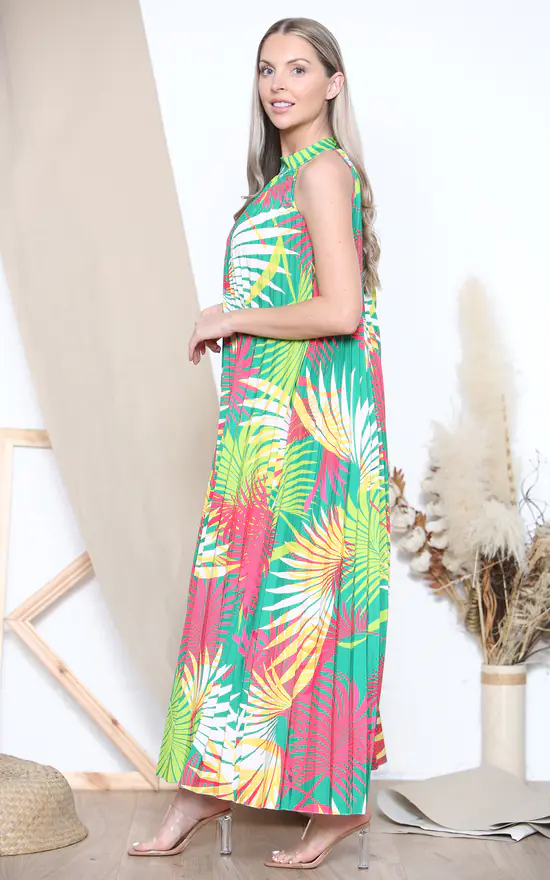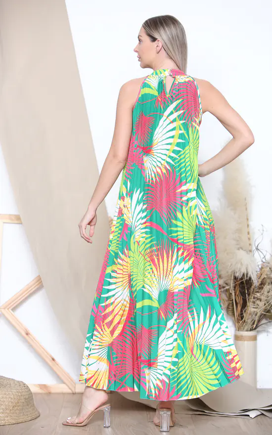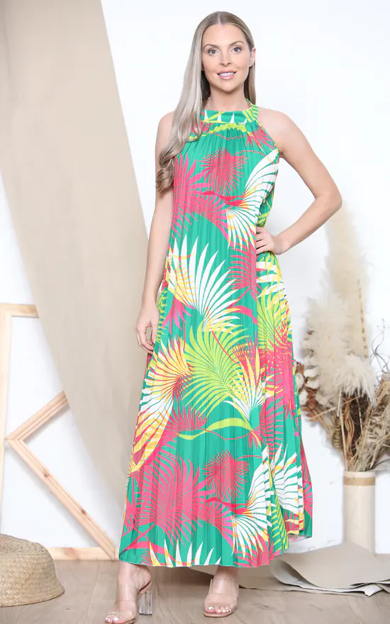 This halter neck dress has a relaxed fit and a stylish pleated design. Loose fit and sleeveless design are great for warm weather. Eye catching prints make this dress a must have for any event this summer.