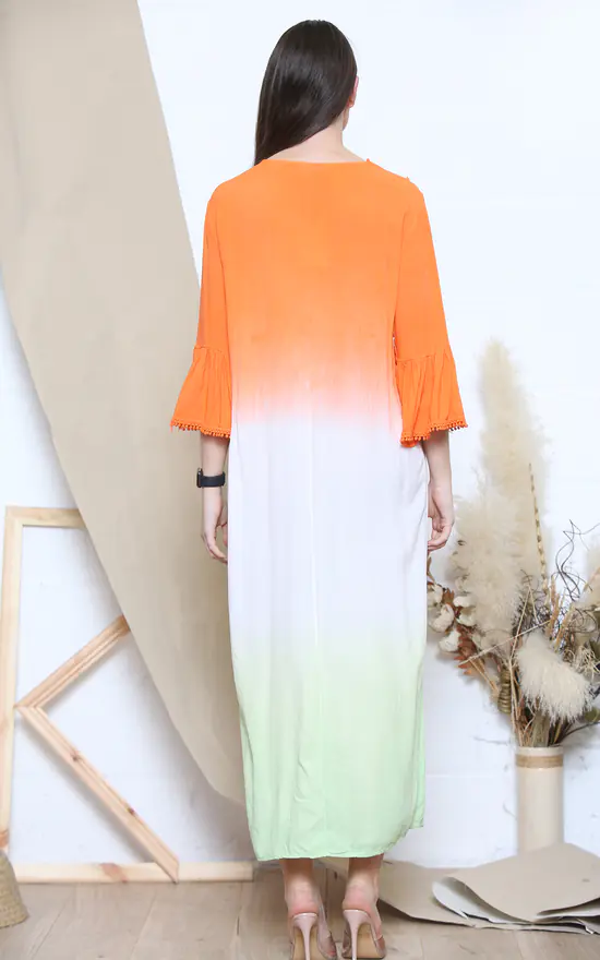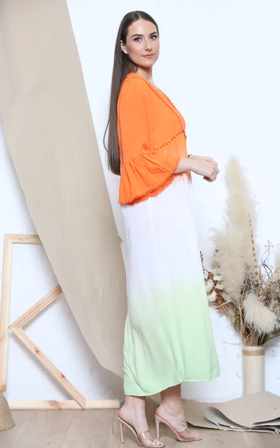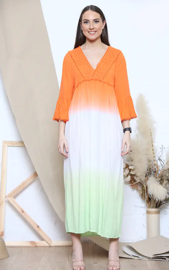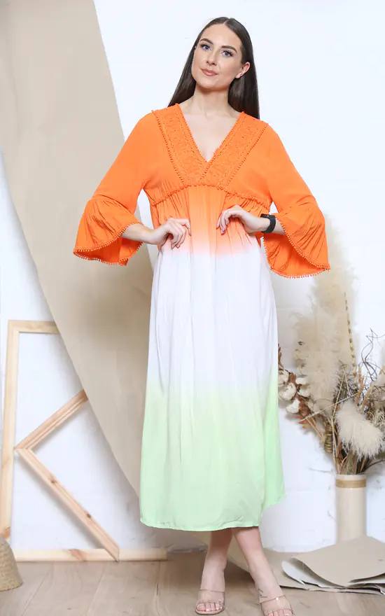 This smart dress has a colourful tie dye pattern and eye catching lace trim. Deep V neckline and loose fit are great for warmer days, long sleeves help in cooler evenings. This dress is perfect for holidays or smarter events this year.