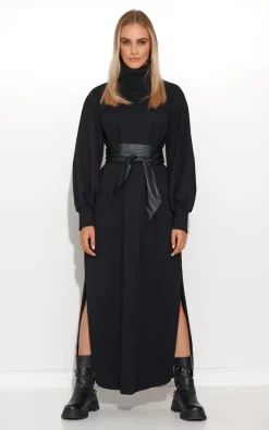 A dress in sweatshirt knit, imitating an extended version of the classic women’s sweatshirt. The dress comes in one universal size. It has a fleshy turtleneck made of ribbed knit and long sleeves finished with welts. You can wear it loose and then the dress gives you a relaxed and casual feeling. You can also fasten it with the leather belt included in the set. There are two slits at the bottom of the dress which provide freedom of movement and add nonchalance when worn. At the back, just under the turtleneck, there is a decorative shiny macadamia patch.