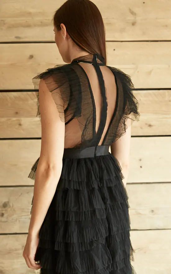 Our luxe black tulle maxi dress is the ultimate occasion outfit. Packed with detail, the high neck has a tie bow, the layers of small ruffles add texture, the ribbon waist and lace cap sleeves will have you standing out for all the right reasons. This dress has a short built in underskirt lining as seen in the images.