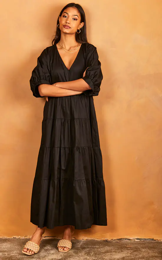 Black Γ se dress. This Γ se dress wonβt disappoint as the perfect go-to look. It is cute and effortless yet a beautiful feminine dress. With a v-neckline , puffed sleeves and subtle two-tiered flared skirt, itβs a stunning Maxi dress to add to your collection.