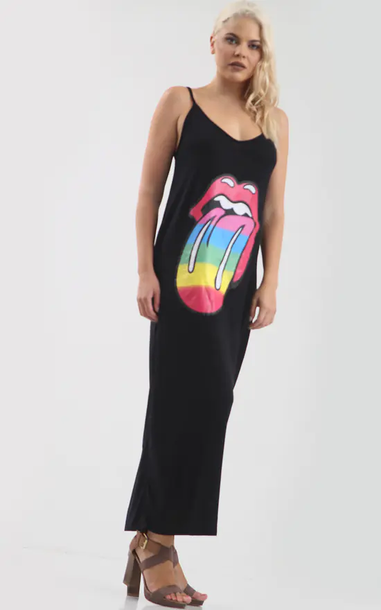 Slay summer in this Black Strappy Rainbow Graphic Print Maxi Dress! Dress features a super soft, jersey material, cami straps and oversized fit for those HOT summer days