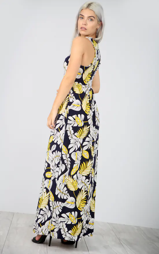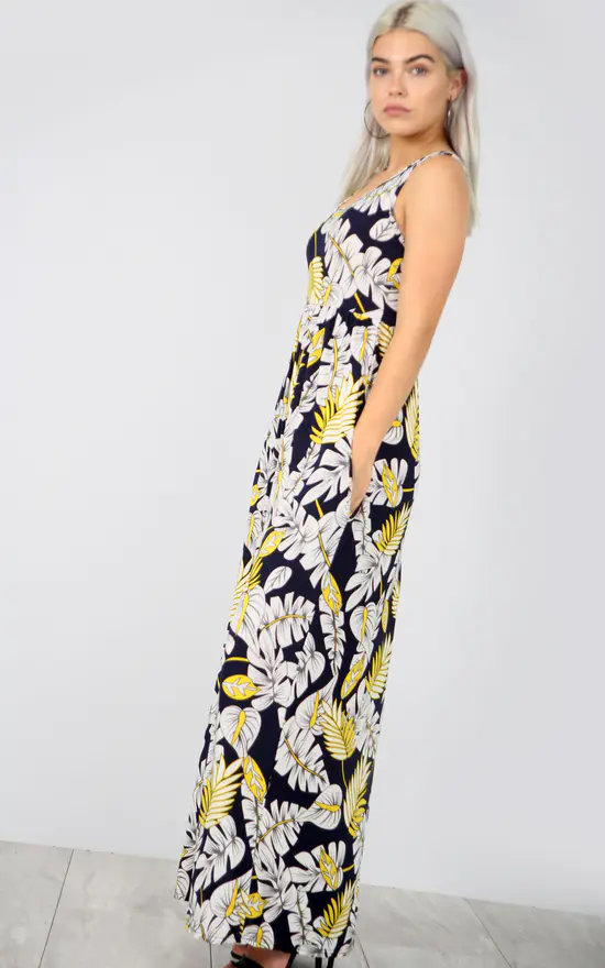 slay in style this summer in this Floral Print Slinky Navy Maxi Dress With Pockets featuring a scoop neck line, white, navy and yellow floral print and floaty fit