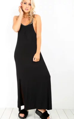 Channel super cute vibes in this Strappy Basic Jersey Side Split Maxi Dress in Black, featuring a chain neck detail and racy side split. Dress it up with killer heels and a clutch to own the night