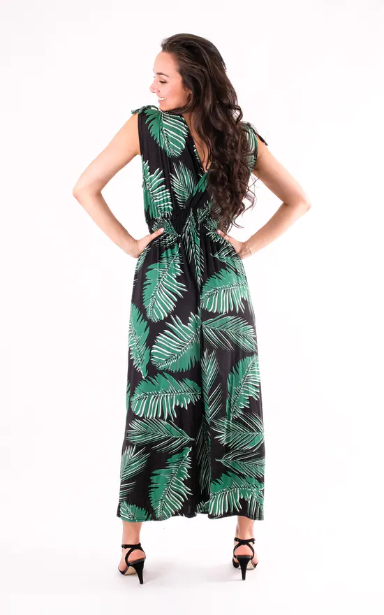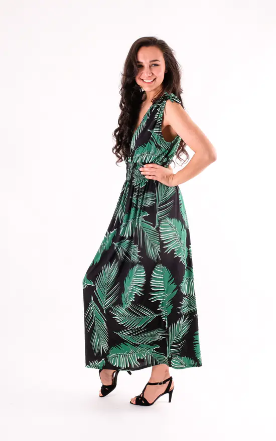 This gorgeous leaf print maxi dress with v neck, sleevesless and tiered detail is a great addition for this season. Add a leather jacket and pair of heels for a glam look or a pair of trainers for a casual look.