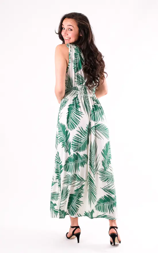 This gorgeous leaf print maxi dress with v neck, sleeveless and tiered detail is a great addition for this season. Add a leather jacket and pair of heels for a glam look or a pair of trainers for a casual look.