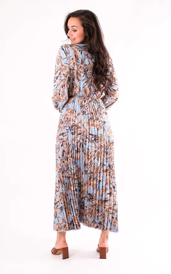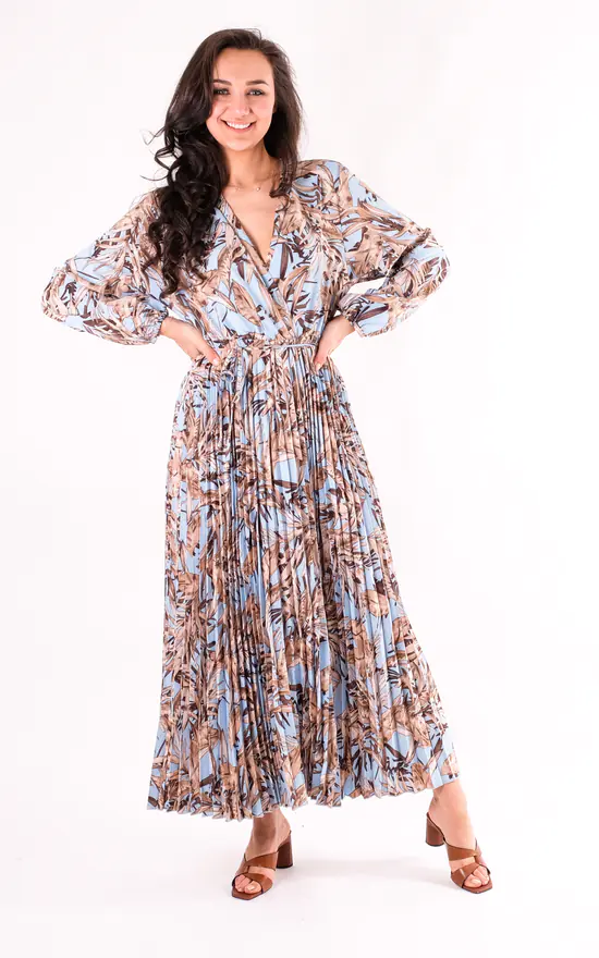 This gorgeous leaf print maxi dress with v neck, long sleeves and tiered detail is a great addition for this season. Add a leather jacket and pair of heels for a glam look or a pair of trainers for a casual look. Gorgeous pleated hem. In Blue