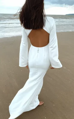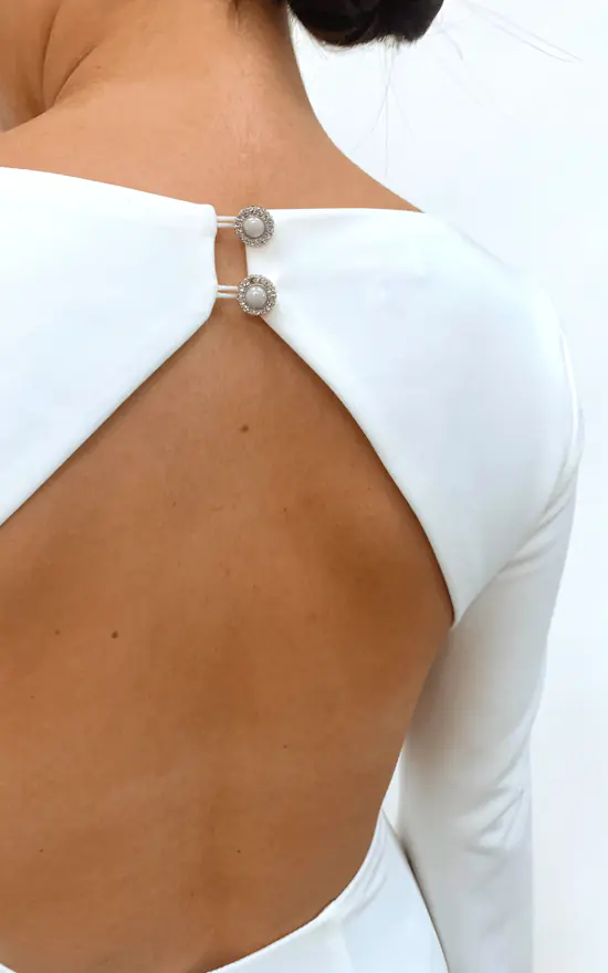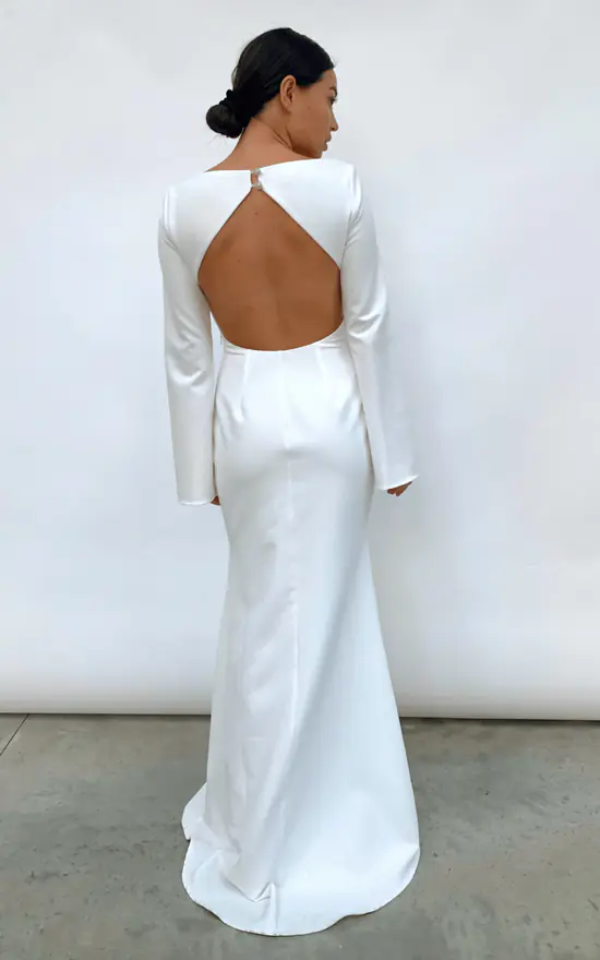 The Olivia bridal gown is made from an off white stretch-crepe which flatters every body shape. The modest neckline is balanced by an open back that will look so elegant beneath a sheer veil.