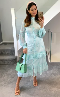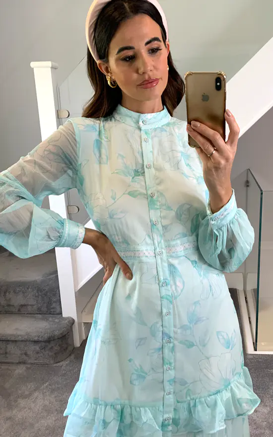The Alessia Dress is a chic take on the classic maxi dress. This chiffon piece has sheer sleeves and a tiered skirt that will move with you, this piece is sure to elevate your look for any occasion. Features central buttons down the centre and high neck detail. Generous fit for comfort.