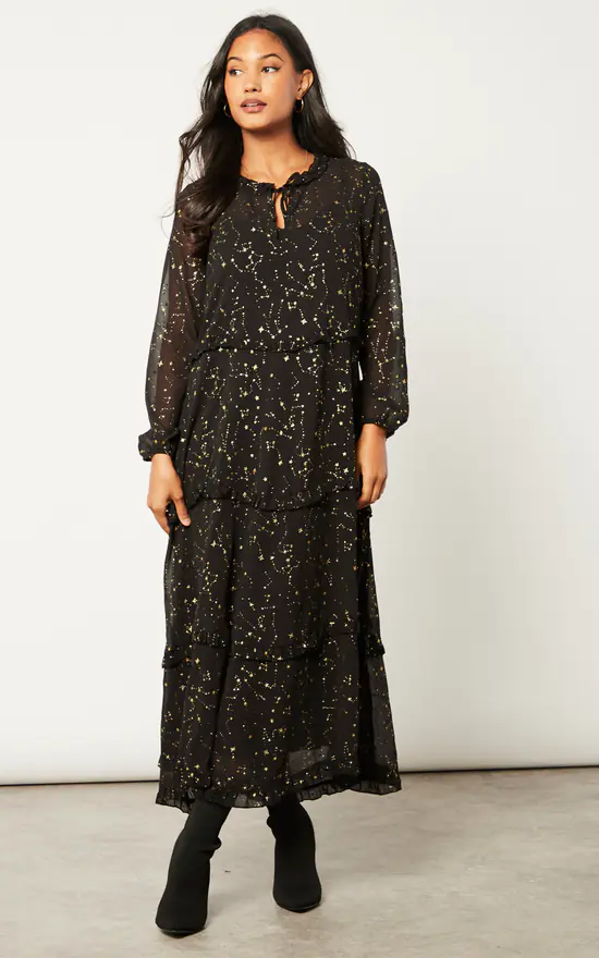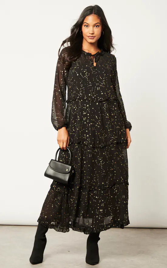 Elegant and stylish, this Constellation Print Tiered Frill Dress is perfect for Christmas parties.
