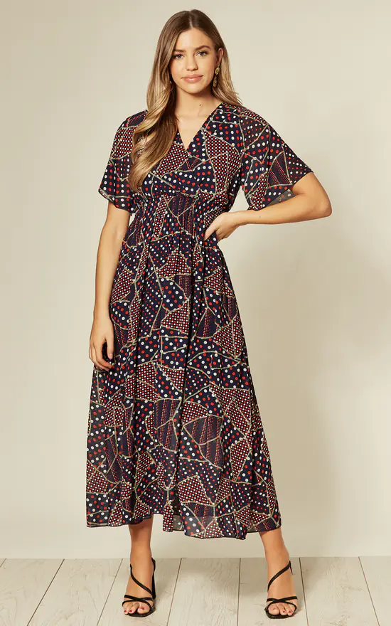 We’re loving this dress. This versatile Navy blue maxi-length number features short flare sleeve, wrap v neck, multi coloured spotty print. Shirred waist, tie back neck and inner lined. Wear with strappy heels and statement jewellery for wedding and parties, or dress it down for your night out.