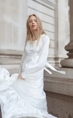 Discount π Leiva White Satin Long Maxi π Dress With Sleeves, High Wasted A Line π Dress β