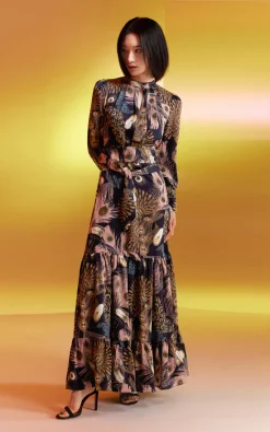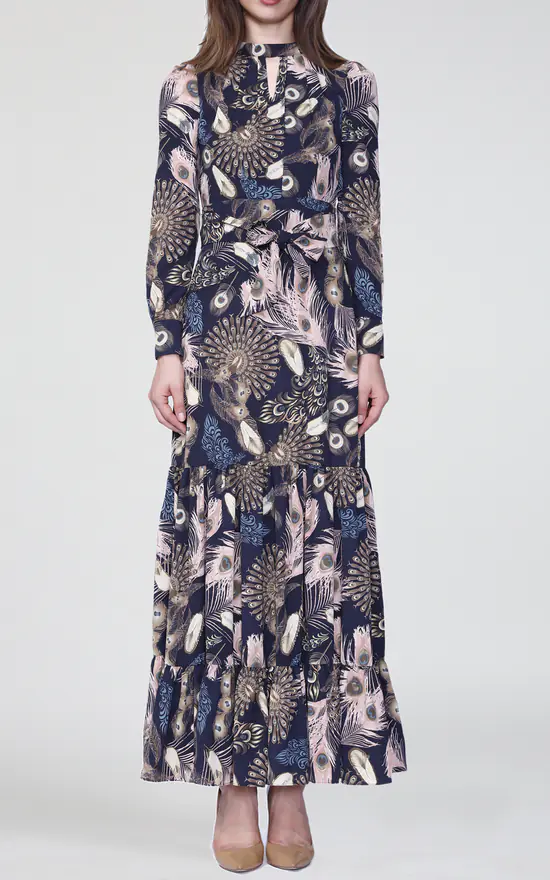 Unmissable this autumn, the bohemian style: maximize your look with this unique peacock feathers print. Flattering cut, highlighting the waist with a belt tied in a bow and conveniently covering the arms for the first chilly days. Generous movement while walking thanks to a generous volume on the hem. For an elegant day wear and an after-work cocktail time.