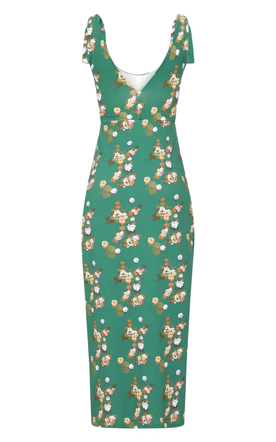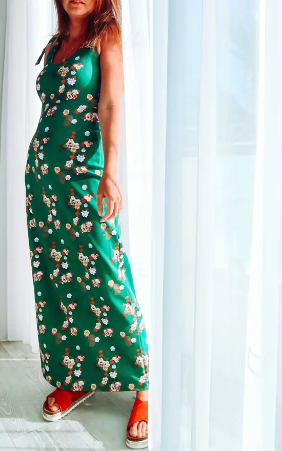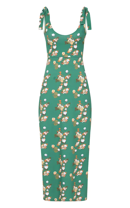 The day-to-night dress perfect for holidays, a wedding guest outfit or those summer parties. The Green Floral Cotton Maxi Dress is cut from a mid-weight jersey with beautiful bespoke floral print detailing. The self-tie shoulder straps are designed for a versatile and adaptable fit to suit your body shape.