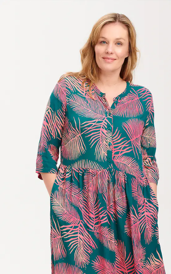 Our Lauren design is the perfect relaxed smock dress. Cut with a loose fit, it has a collarless shirt upper, half-length sleeves and an on-trend tiered skirt – with pockets. The Palm Fronds print features large Batik palm foliage in shades of pink, on a green base.