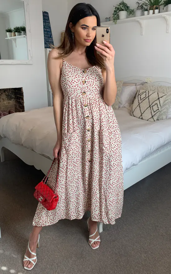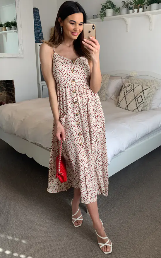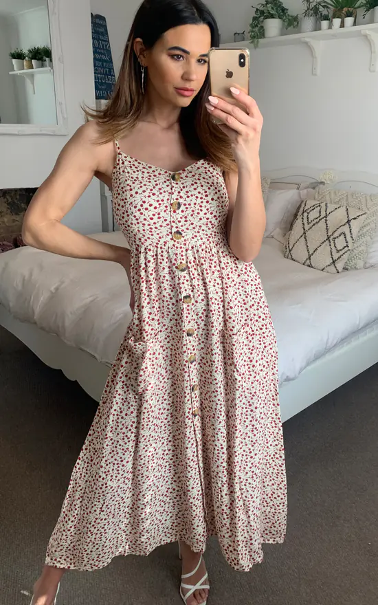 Made with front button fastening for style and fit, this midi dress has adjustable straps for proper fit.