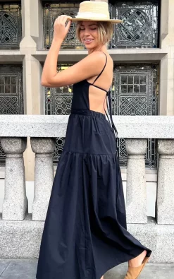 Backless Strappy Tiered Poplin Maxi Dress in Black Color is the best seller at The Taylor Clothing. Black, symbol of elegance, meets with the backless details and gives a flirty touch to your look. You’ll feel comfy in this relaxed fit backless maxi dress thanks to strappy tiered and square neck details. Our collection is 100% sustainable made from 100% organic cotton.