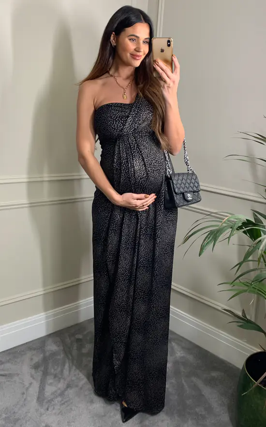 Introducing our new Constellation Black print, this dramatic one-shoulder asymmetric maternity gown is adorned with flecks of silver/gold toned shimmer. With a gathered sweetheart bodice and faux-wrap skirt, the Galaxy is designed to fit and flatter as well as enhance your pregnancy curves. Ideal for the most special of occasions, whether a wedding, charity ball or black-tie event, you are looking at maternity glamour at its finest.