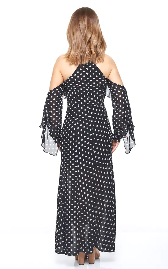 Turn heads this season in the stunning Black Polka Dot Chiffon Maxi Dress from Want That Trend.